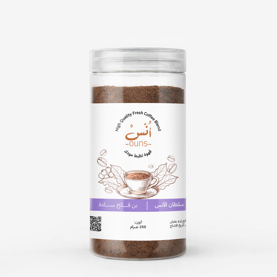 سلطان الأنس معمولة من حبوب أرابيكا 100٪ مختارة بعناية، بطحن تركي ناعم وتحميص فاتح أقرب للوسط يبرز النكهة الطبيعية للحبوب بدل ما يغطيها.